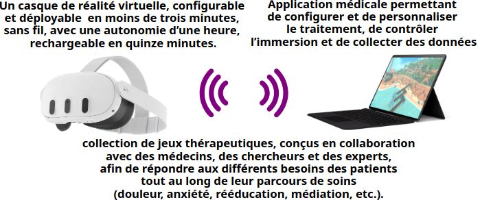 Axis 2 focuses on patient remobilization through VR and AR exergames. This immersive VR/AR rehabilitation application, controllable by the practitioner, enables the creation of a “virtual prescription” with a customized list of exercises for the patient to perform through the application.